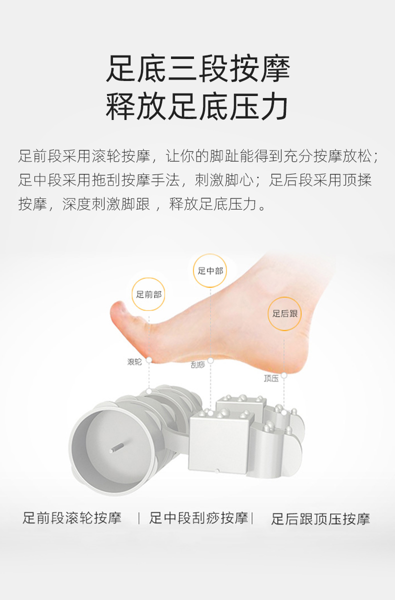 腳底 滾輪按壓(腳趾)、刮痧(腳底)、頂(腳后跟)按摩 (多模式,多強(qiáng)度)